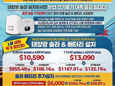 지금 바로 솔라 & 배터리 설치하세요! 올해가 마지막 기회입니다! 호주 유일 17년 경력 CEC 정부 인증 솔라 & 배터리 시공업체 - 25년 패널 제품 워런티 & 30년 패널 성능 워런티 - AUSS SOLAR…