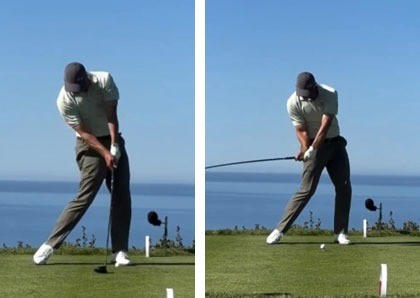 지난주 사진에서 클럽 샤프트의 휘어짐을 볼 수 있습니다. 즉 두 손이 오른쪽 무릎 앞에 도착할 때 즈음 클럽 헤드가 던져지고 있다는 말이죠. 여기서 우리가 눈 여겨 봐야 할 점은 뭘까요?