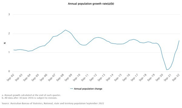 호주 인구는 2022년 9월30일 기준으로 약 2,612만4,814명으로 집계됐고 이 날까지 12개월동안 1.6% 증가했다고 통계국(ABS)이 16일 발표했다.
