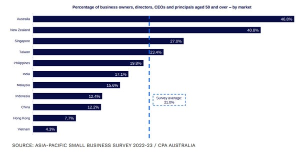 호주공인회계사협회(CPA Australia, 이하 CPA)가 11개 시장(국가)의 4,280개 사업체를 조사한 결과, 호주 소규모 사업주의 46.8%(1위)가 50세 이상인 것으로 나타났다.