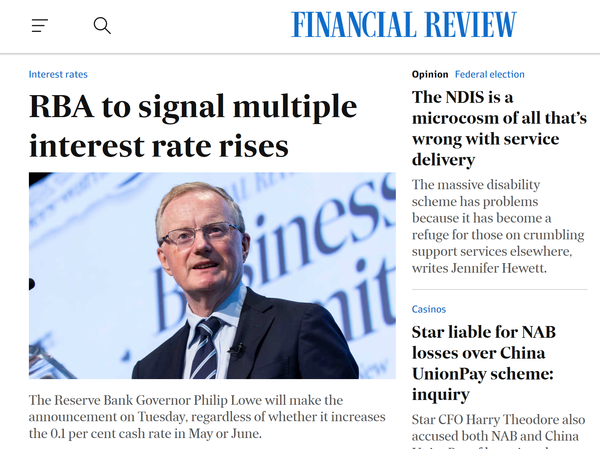 AFR(파이낸셜리뷰)지는 4월29일자에 중앙은행이 여러번 금리를 올릴 것으로 전망했다