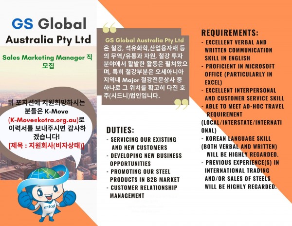 호주 취업정보 - GS글로벌 주 시드니 총영사관 0 10104 2020.06.17 13:30 출처: 코트라 시드니무역관 K-Move센터 [출처 : hello 워홀-호주성공길잡이-생활 정보]