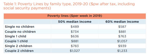 호주의 빈곤선은 세금 공제 후 가계 중간소득의 50%를 의미한다. 2019-20년 독신자는 주당 $489, 2자녀 있는 커플 가족은 주당 $1,027이 빈곤선이다.