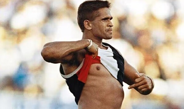 16817832539403.jpg 1993년 AFL 경기 중 동료 원주민 선수가 인종차별을 당하자 유니폼 상의를 올리고 '검은색이 자랑스럽다'라고 반박한 니키 윈마 선수(세인트킬다)