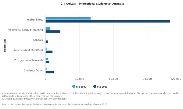 호주 체류 기간 중앙값은 18일로 2021년 30일에서 12일 줄었다. 올해 2월 약 14만2,580명의 외국인 유학생들이 호주에 입국했다. 1년 전보다 9만3,270명 늘었다. 코로나 팬데믹 시작 전인 2019년 2월보다 22.5% 낮은 수준이다.