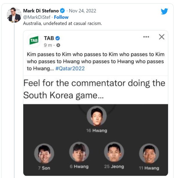 지난 주 TAB은 공식 트위터 계정에 “킴에게 패스, 킴은 킴에게 패스, 킴은 황에게 패스, 황은 다시 황에게 패스. #카타르 월드컵 2022, 한국 경기 해설자를 경험해 보라”는 트윗을 한국 대표팀 라인업 사진과 함께 올렸다.