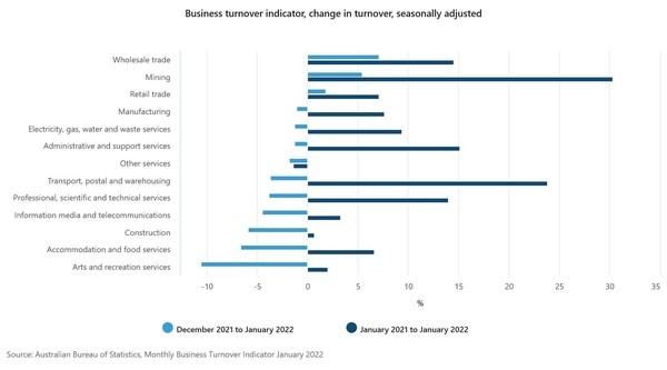 2022년 1월 한 달동안 13개 산업군 중 10개가 계절별 요인을 감안한 월별 매출(seasonally adjusted monthly business turnover)이 하락했다고 통계국(ABS)이 15일 발표했다.