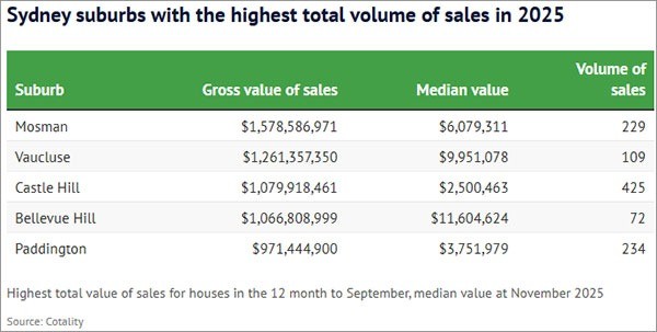 시드니에서 지난해 가장 많은 금액의 주택 거래가 이루어진 지역은 항만과 가까운 고급 주거지들이었습니다. 특히 모스만(Mosman)이 전체 거래 금액 1위에 올랐으며, 바우클루즈(Vaucluse), 벨뷰힐(Bellevue Hill) 등도 상위권을 차지했습니다. 흥미롭게도 가족 친화적인 캐슬힐(Castle Hill)도 높은 거래량으로 목록에 포함되었습니다.