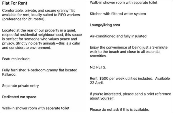 퍼스의 한 임대 공고가 온라인에서 큰 공분을 일으키고 있습니다. 해당 공고는 비치사이드 지역 Kallaroo의 풀옵션 1베드 그라니 플랫을 주당 500달러에 임대한다고 했지만, 특정 직군(FIFO 근로자, Fly-In Fly-Out)만 선호한다는 조건이 논란의 중심이 됐습니다.