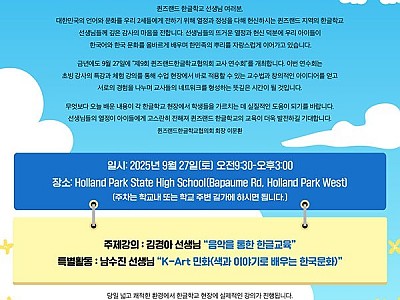 일시: 2023년 9월 27일(토) 오전9:30-오후3:00 장소: Holland Park State High School(Bapaume Rd, Holland Park West) 주제강의: 특별활동: 1) 김경아…