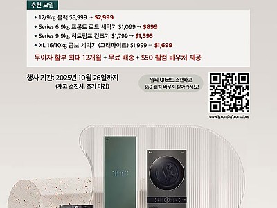 지금이 바로, 우리 집 세탁 공간을 바꿀 시간! 최대 $1,000 할인! 세탁기 · 건조기 · 워시타워 · 스타일러까지 프리미엄 LG 제품을 특별가로 만나보세요. 추천 모델: WashTower™ 12/9kg 블랙 …