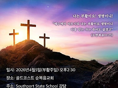 2026 골드코스트한인교회협의회 부활절 연합 예배 나는 부활이요! 생명이니! “예수께서 이르시되 나는 부활이요 생명이니 나를 믿는 자는 죽어도 살겠고” (요한복음11:25) 일시: 2026년 4월 5일(부활주일)…