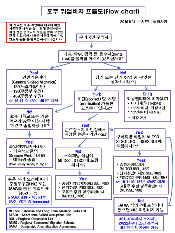 호주 취업비자 흐름도(flow chart) 주 시드니 총영사관 0 14785 2019.10.09 10:30 호주 취업에 관심을 두고 계시는 분들이 쉽게 보실 수 있도록 정리한 "호주 취업비자 flow chart" 입니다. [출처 : hello 워홀-호주성공길잡이-생활 정보]