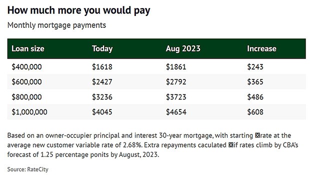 CBA의 경제전문가들은 “기준금리가 1.25%로 오르면 모기지 상환 부담으로 가계의 가처분소득(household disposable income)이 15% 줄어들 것”으로 전망했다. 이들은 “호주중앙은행이 2024년까지는 1.25%로 기준금리 유지할 수 있지만 그 후 2%까지 오를 수 있다”고 전망했다. 이 예상이 맞는다면 40만 달러 홈론의 월 상환 부담이 $402로 늘어난다.