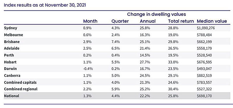 지난 1년동안 전국 평균 집값 상승률은 22.2%였다. 연간 22.2%가 올랐다는 것은 호주 주택 중간 가격(median value)이 12만6,700 달러 올랐다는 의미다. 전국 지방은 25.2%, 주도는 평균 21.3% 올랐다. 주도의 상승률은 호바트(27.7%), 시드니(25.8%), 브리즈번(25.1%), 캔버라(24.5%) 순으로 높았다.